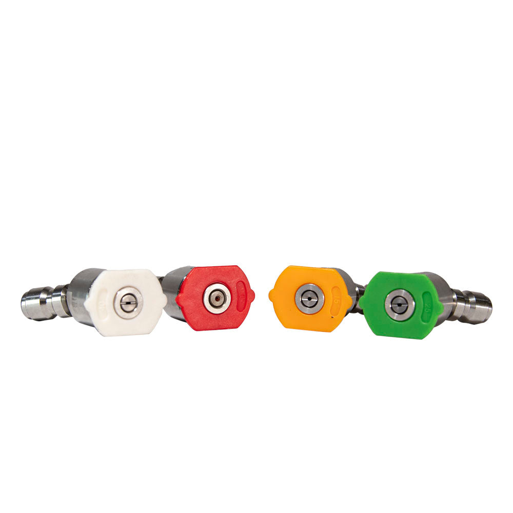 These nozzles connect via standard 1/4" quick connect fittings, making them compatible with most short guns and lances. The range of spray angles means you're covered for everything from targeted rinsing to wide, soft water coverage for foam removal or final rinses.