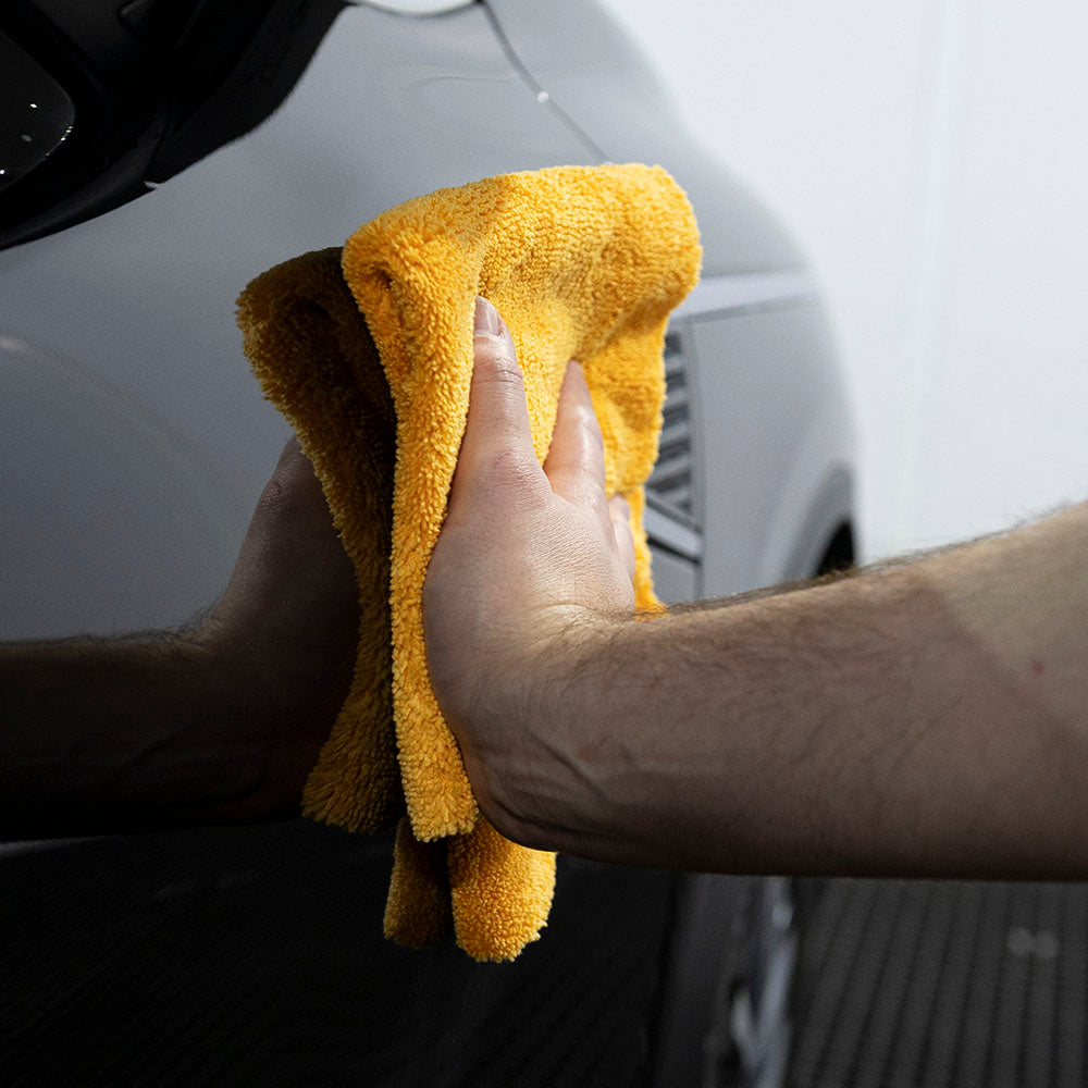 This dual-sided construction is what really provides the true versatility, giving the VERSO it's name. The short pile side handles removal work (e.g. coatings), residue, and interior cleaning, while the high pile excels at final wipes, and gentle drying. At 420GSM, it feels substantial in hand but still moves freely across surfaces without dragging or saturation - whilst still providing enough bite to be functional, balancing the increased density of fibres.